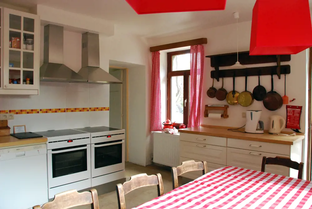 - CUISINIERES : La cuisine dispose de 2 cuisinières vitrocéramiques (8 points de cuisson), deux fours électriques et d’un four micro-onde.