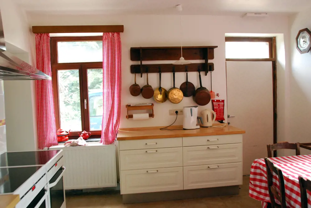 La cuisine est équipée de 1 frigidaire (300 litres) + compartiment surgélateur (50 litres) . Au besoin, un congélateur (250 litres) et un second frigidaire (300 litres) peuvent être mis en fonction dans la pièce voisine.